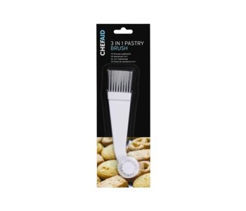 Washable nylon brush for basting and glazing. Wheel on the handle for crimping and decorating. Cutting edge for trimming